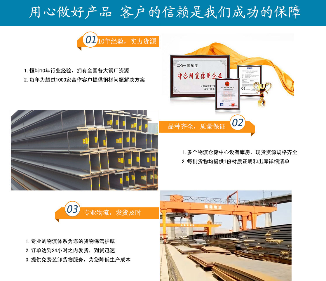 蘭州恒坤商貿(mào)有限公司立足于鋼材貿(mào)易,主要經(jīng)營:鋼板、角鋼、工字鋼、槽鋼、H型鋼、鍍鋅槽鋼、鍍鋅角鋼、鍍鋅板、鍍鋅卷、鍍鋅圓鋼、鍍鋅工字鋼多種型號鋼材產(chǎn)品。多年來,我公司始終堅持質(zhì)量第一,信譽至上的經(jīng)營方針,與酒鋼、包鋼、八鋼、唐鋼、鞍鋼、萊鋼、兗礦、日照鋼鐵、濟鋼,成都、天津等多家企業(yè)達成大批量物資供應協(xié)議,并且與省內(nèi)外多家客戶建立了合作關系。